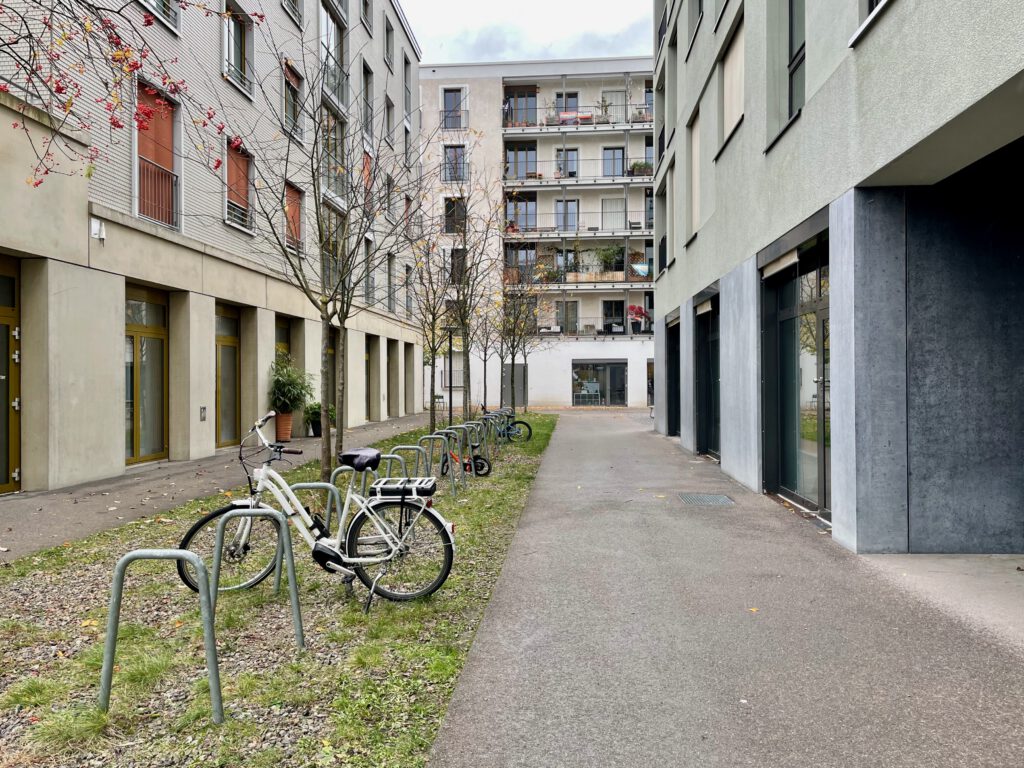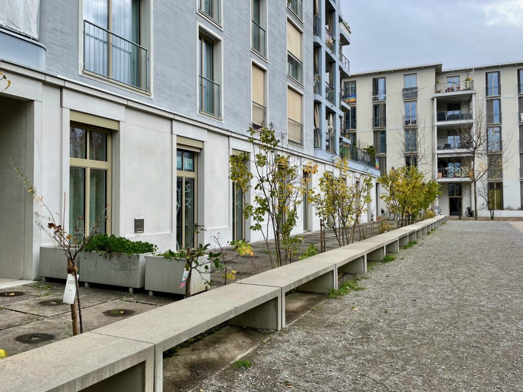 Nur in den Erdgeschossen (Hochparterre) zu den umliegenden Grünräumen wird gewohnt. Dadurch besteht größtenteils eine Unterlegung des Wohnens mit gewerblichen und gemeinschaftlichen Nutzungen im Erdgeschoss. Die Nutzungen sind abgestuft zoniert, in „öffentlich“ an der äußeren Erschließungsstraße mit Läden und Gastronomie, „quartiersbezogen“ mit Gewerbe, Sozialräumen, Werkstätten und gemeinschaftlich genutzten Allmend-Räumen (gesamt ca. 800 m²) sowie „privat“ mit Wohnen zum Park. Die räumliche Struktur und das Finanzierungskonzept der Erdgeschossflächen erlauben es den Bewohner:innen partizipativ über die Allmend-Nutzungen (mit-)zu bestimmen und ihre gewerblichen, kulturellen und sozialen Aktivitäten in den Sockel „auszulagern“. Insgesamt wird eine lebendige Nachbarschaft mit verschiedenen Aktionsschwerpunkten durch die nach Öffentlichkeitsgraden „kuratierte“ Wechselwirkung zwischen Erdgeschossnutzung und dem Quartiersfreiraum gefördert. Nach Aussage der Genossenschaft und auch aufgrund fehlender, zum Teil sichtbarer Gebrauchsspuren, hätte eine stärkere Aneignung und Aktivierung der Quartiersräume durch eine „weichere“ Ausführung der Vorzonen erreicht werden können.