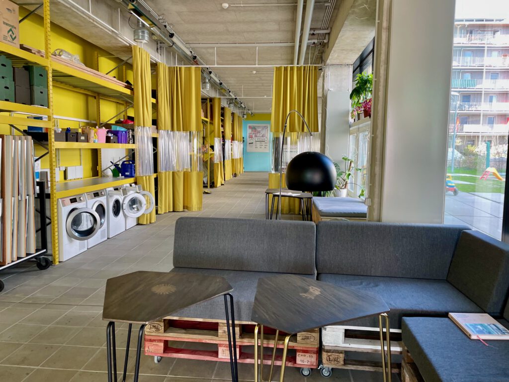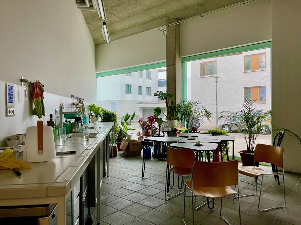 Daneben bietet das Erdgeschoss im San Riemo Raum für eine großzügige Gemeinschaftshalle mit Eingangslobby, Waschküche, Spiel- und Aufenthaltsräume, für eine gemeinschaftlich genutzte Werkstatt, für ein Gästeapartment und für eine Gemeinschaftsküche, die einen direkten Zugang zum öffentlichen Raum hat. Durch eine Schiebetür und einen schwellenlosen Übergang zum Vorplatz und Gehweg, lässt sich die Küche in den öffentlichen Raum erweitern. Die Küche ist durch ein großes Fenster einsehbar. Die im Sommer ausgefahrene Markise, über die in derselben Pflasterung wie der Gehweg ausgebildeten Vorzone, wirkt einladend, bespielt die platzartige Situation und trägt zur Interaktion mit dem nachbarschaftlichen Umfeld bei. Über eine Mobilitätsstation und gemeinsam genutzte Tiefgarage ist das San Riemo auch mit dem benachbarten Genossenschaftsbau RIO verknüpft. Die großzügigen Gemeinschaftsflächen und gemeinschaftlich nutzbaren Einrichtungen werden von den Bewohner:innen des San Riemo über eine Umlage finanziert. Zum Ausgleich haben sie auf einige Quadratmeter an privater Wohnfläche in ihren Wohnungen verzichtet.
